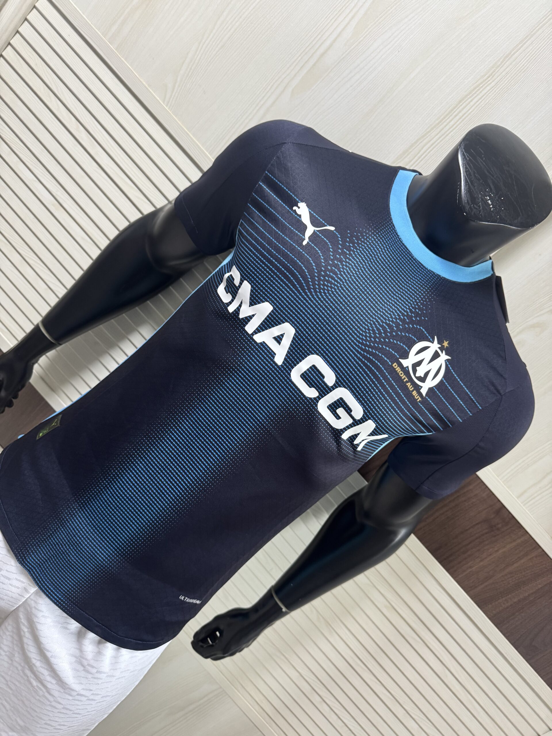 Represent Marseille with the official 2024/25 Away Jersey by Puma. Crafted in premium Ultraweave fabric, this dark navy kit features sky blue stripe detailing, a ribbed crew neck collar, and the iconic OM crest embroidered with the club motto “Droit Au But.” Lightweight, breathable, and built for performance — perfect for match day or everyday fan wear.