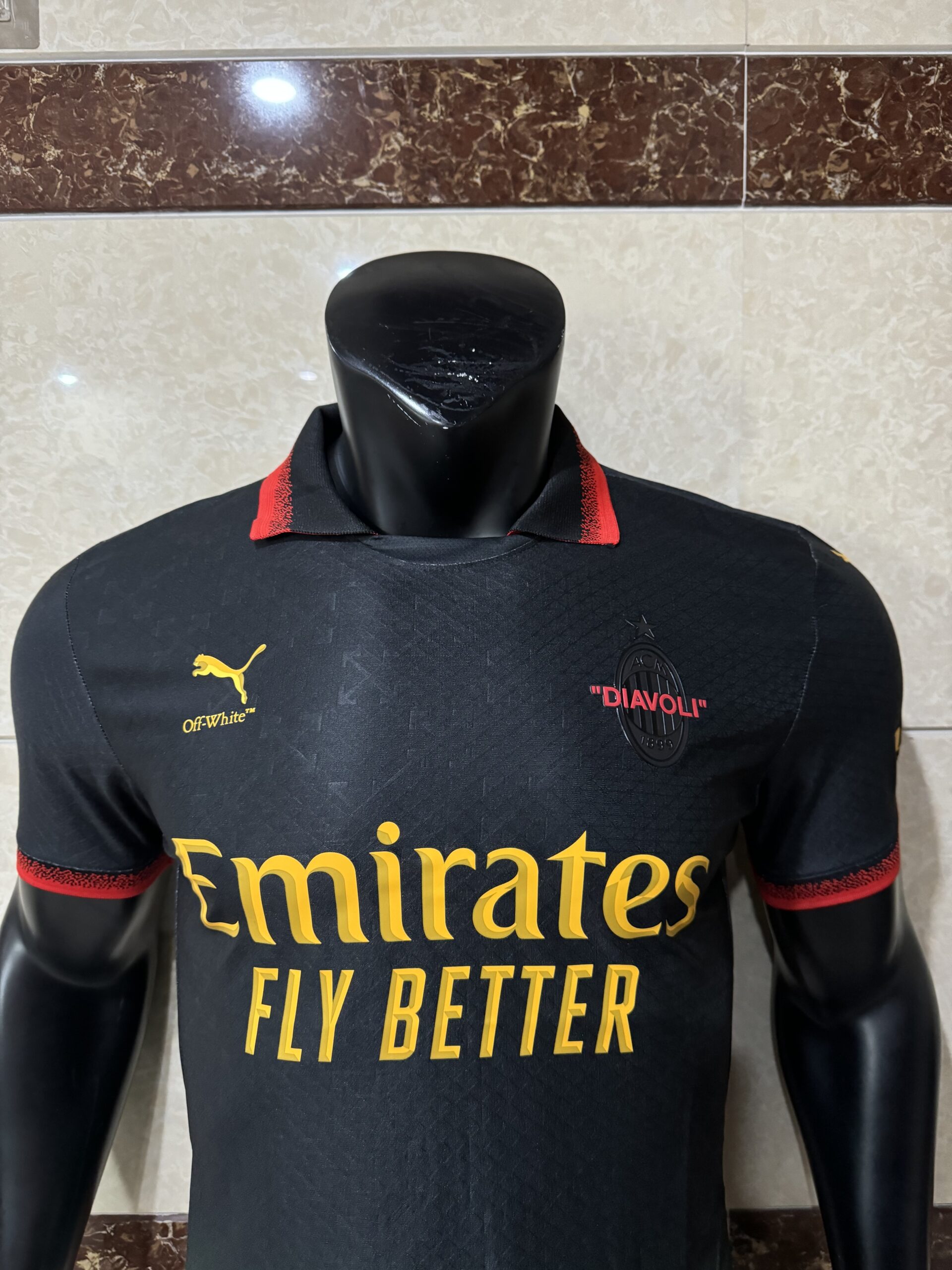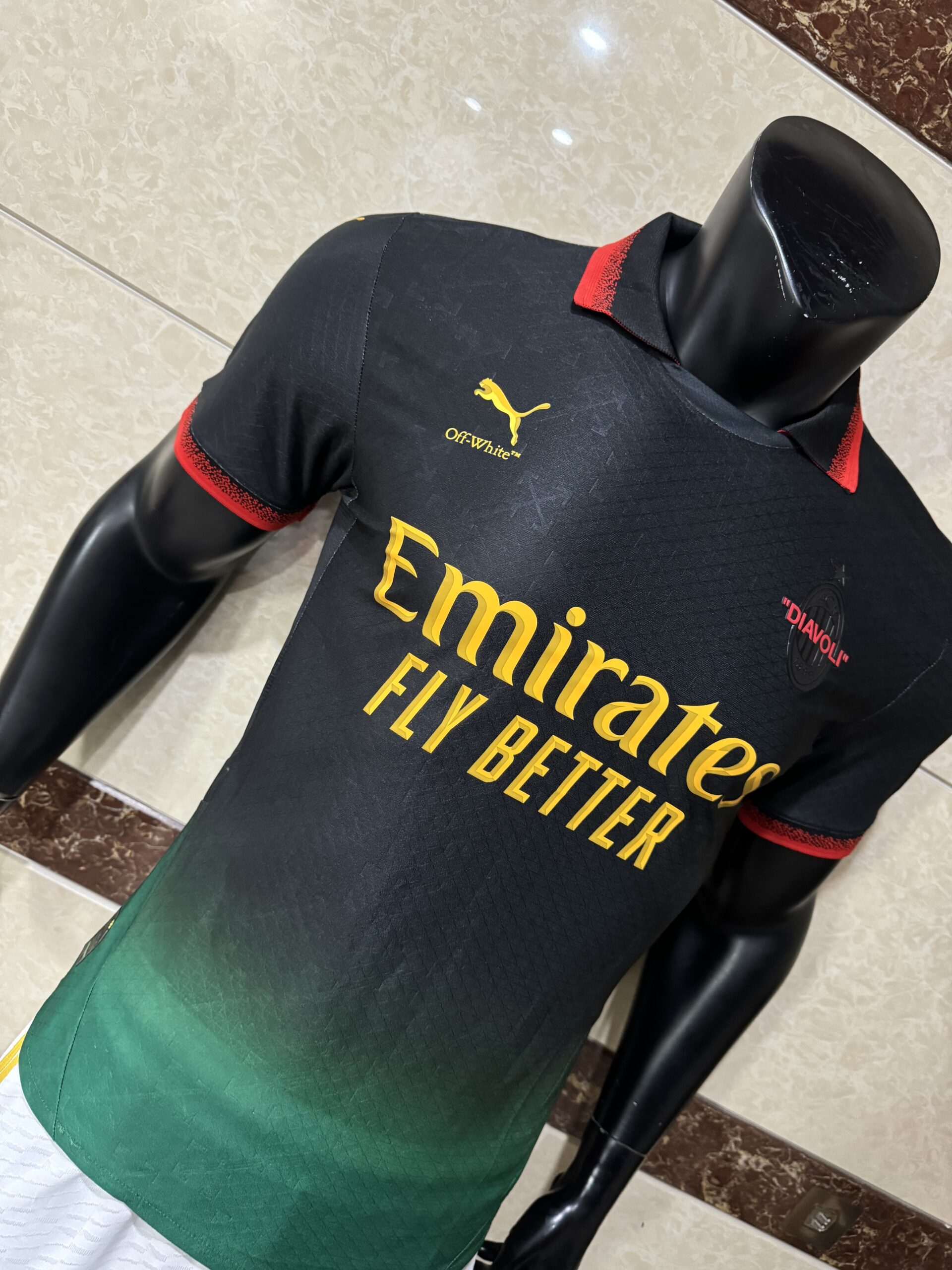 The AC Milan Off-White T-Shirt 2024-25 Puma features official branding from all three partners in this historic collaboration. The Puma logo appears alongside the Off-White™ logo, and the AC Milan branding is integrated throughout the design. The main sponsor “Emirates Fly Better” is printed prominently on the chest of the AC Milan Off-White T-Shirt 2024-25 Puma, connecting this lifestyle piece to the authentic match-day experience . The Off-White™ signature speech marks appear around the “DIAVOLI” branding, extending the collaboration’s aesthetic to every element of the t-shirt . Wearing this branding on the AC Milan Off-White T-Shirt 2024-25 Puma means wearing the mark of the seven-time European champions, the mark of Off-White™’s artistic genius, and the mark of the most celebrated collaboration in football fashion history.